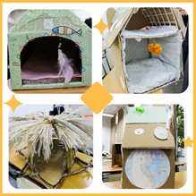 在本次猫舍活动展示环节,胡善竣和卢姿羽同学使用了完全环保塑料泡沫制作材料,配备猫粮储存室,猫舍内垫有一些破旧衣物,保证冬天里猫咪的温暖,猫舍内圈还配备了一圈暖光灯,在夜晚我们也能很好的观察喂养猫咪。原本古灵精怪的主子们,在一阵阵寒风的攻击下,纷纷找着暖和的地方揣手手,他们在树丛角落,在宿舍门口瑟瑟发抖。天气见凉,当白天过去,夜幕降临,猫咪们只能独自面对寒风,解宏超和刘晶晶同学希望用自己的手来为它们搭建避风挡雨的家。于溶花和张睿思同学精致小屋的灵感来源于对流浪猫的热爱,矫健的身姿、柔软的皮毛、动听的叫声,值得拥有世界上最美好的一切,纸壳箱的外壳、挡雨的顶棚,柔软的内里构成了简单却舒适的生存环境。
