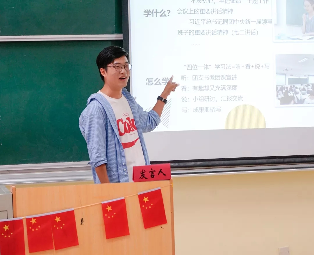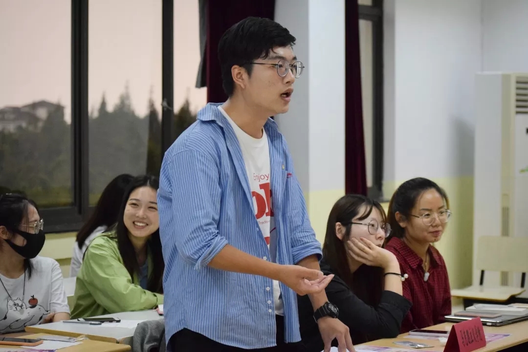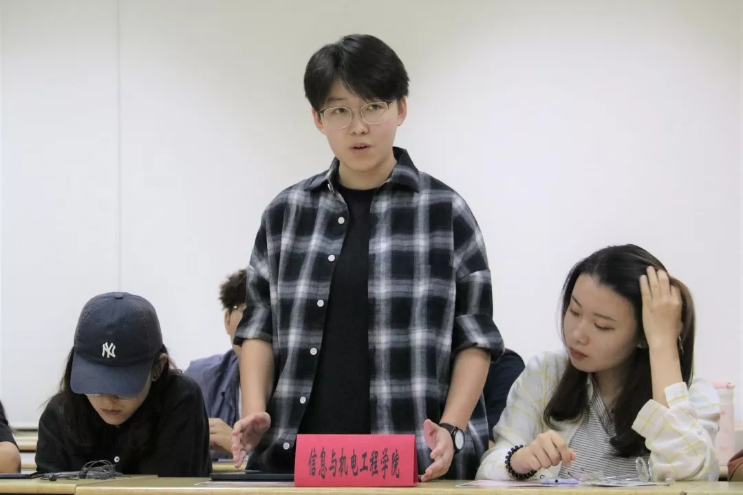 金奕杰同学首先解读了学生会考评的新标准,提出学生会建设要从组织建设深化至思想政治引领。他同学就“理论学习”、“实践寻访”和“宣讲传播”三个方面,以自己学院的活动为例,提出:思政只有融入日常生活才能保证好效果。