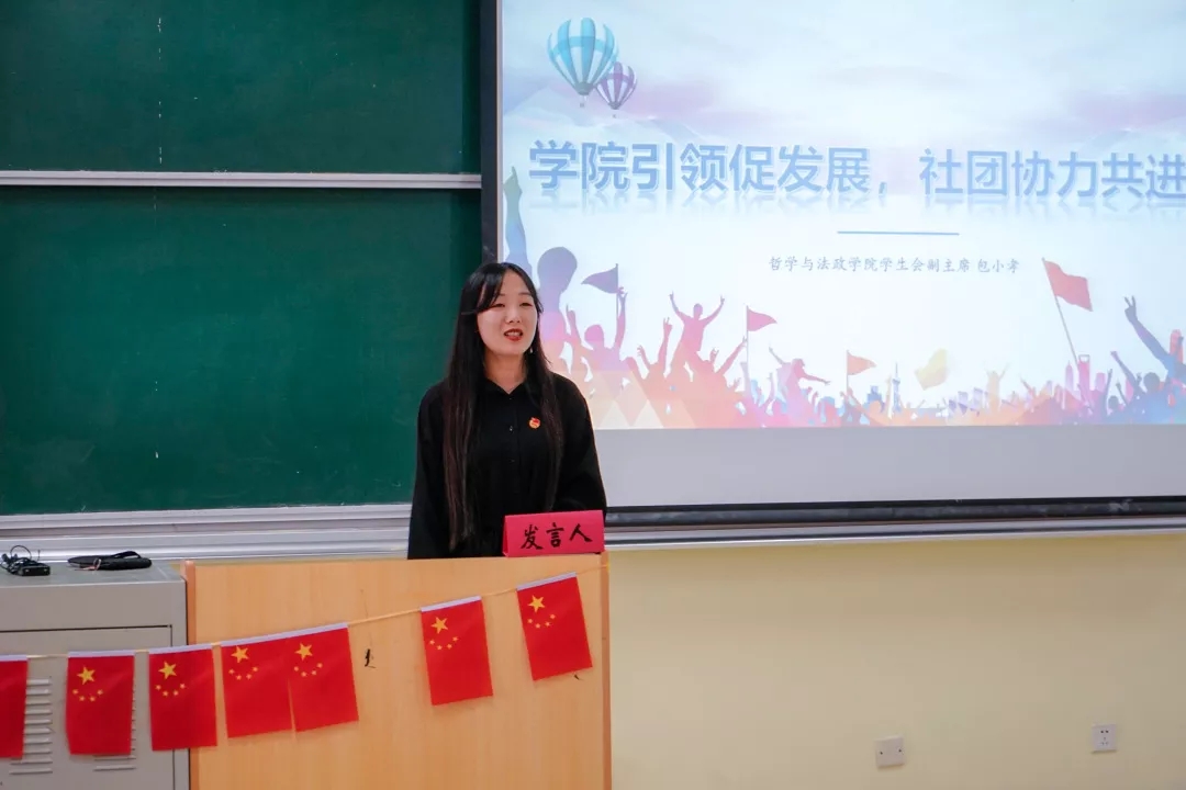 其次,哲学与法政学院学生会副主席包小孝同学以“学院引领促发展,社团协力共进步”为主题,进行了社团部及社团发展相关经验的分享。