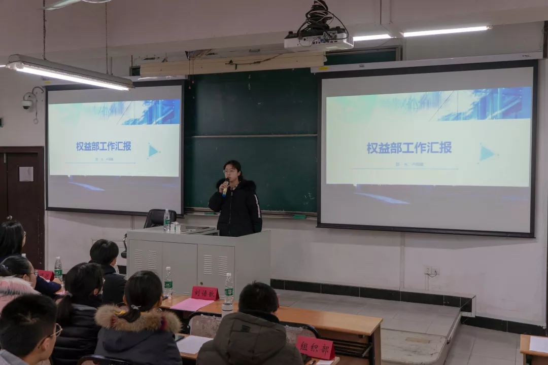 大会进程:首先,由秘书处、权益部、学术部、易班、社团部、社志部、文艺部、体育部部长分别对各自部门本学期工作进行总结。