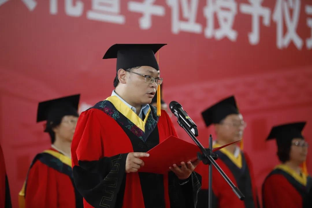 在张波老师致辞结束后,同学们有序上台,由校领导、导师为同学们正冠拨穗,并致以真挚的祝福,且合影留念。