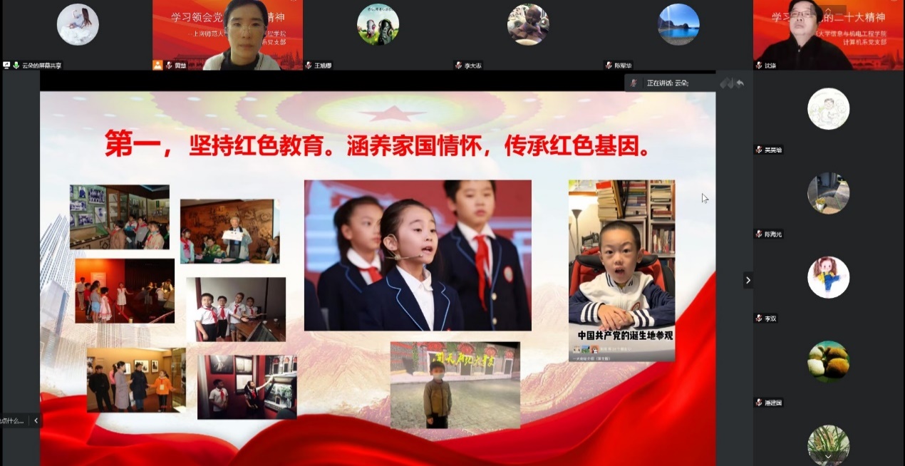 2022年12月主题党日活动中,计算机系党支部特邀上海市黄浦区卢湾一中心小学校长、中共二十大代表吴蓉瑾在线讲授专题党课《以新的奋斗赓续爱的事业》,计算机系全体教师参加学习。