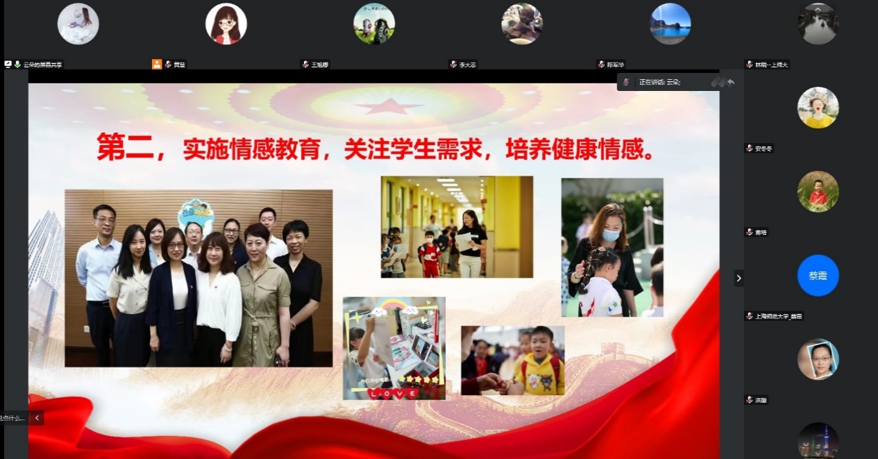 吴校长回顾了二十大报告中的新思想、新观点,从教育、科技、人才三位一体支撑国家发展,到坚定祖国统一的信心,让我们对党的二十大的深远意义有了更加深刻的认识和理解。她还结合卢湾一中心小学的传统特色(“红喇叭”小小讲解员队伍培育、以情育人)和信息化时代下的教育实践(教育信息化建设)分享了个人的学习体会,这些内容饱含着吴校长对孩子们、对教育事业的热爱。